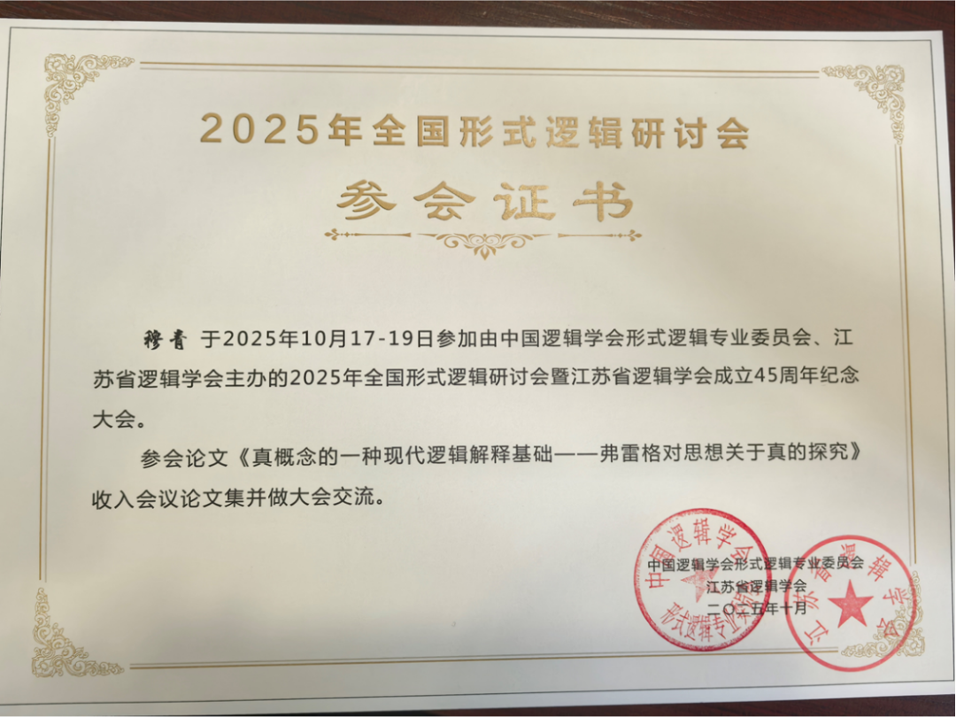 近日,“2025年全国形式逻辑学术研讨会”在南京大学仙林校区召开。我校政史学院教师穆青参加会议,并以《真概念的一种现代逻辑解释基础——弗雷格对思想关于真的探究》为题作学术报告。