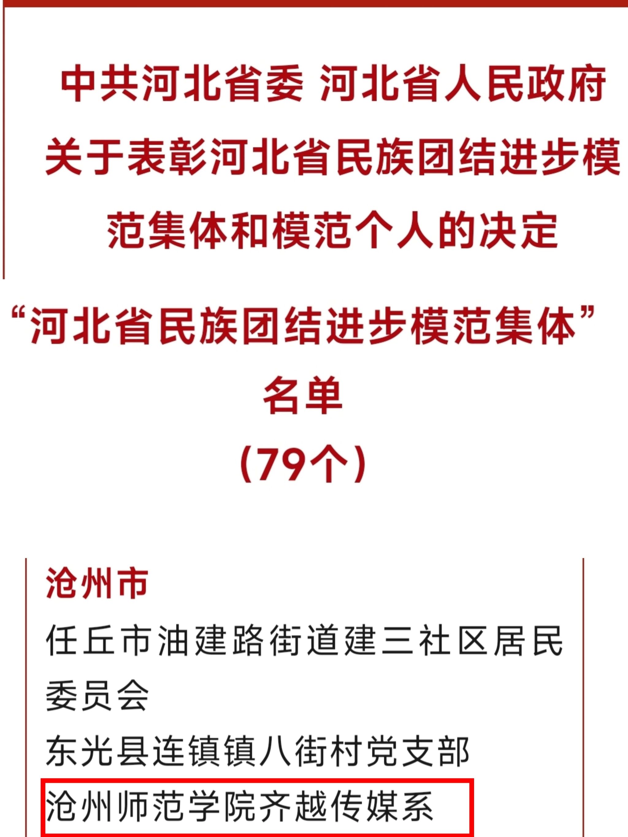 近日,全省民族团结进步表彰大会在石家庄举行,表彰了“河北省民族团结进步模范集体”和“河北省民族团结进步模范个人”。我校齐越传媒学院在民族团结进步领域的工作获得省委、省政府肯定,荣获“河北省民族团结进步模范集体”称号。