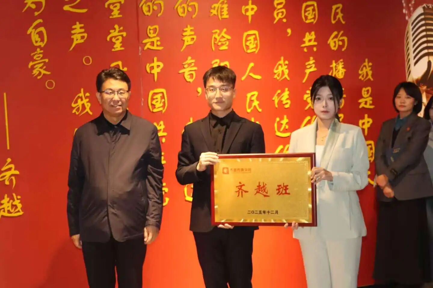 12月18日,“齐越班”授牌仪式在齐越教育馆举行。党委书记云电军和党委副书记范小振分别为2024级和2025级齐越班授牌。