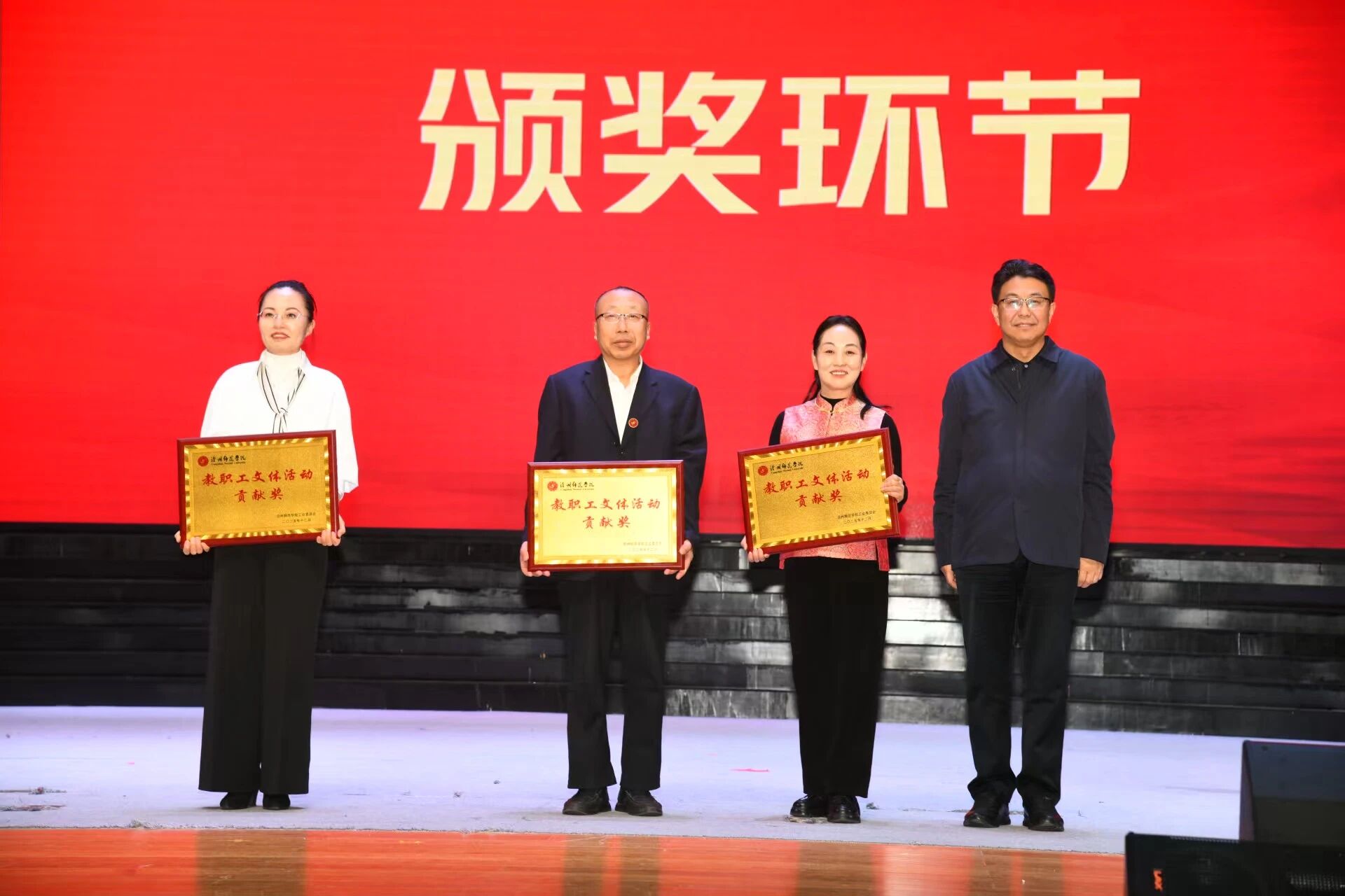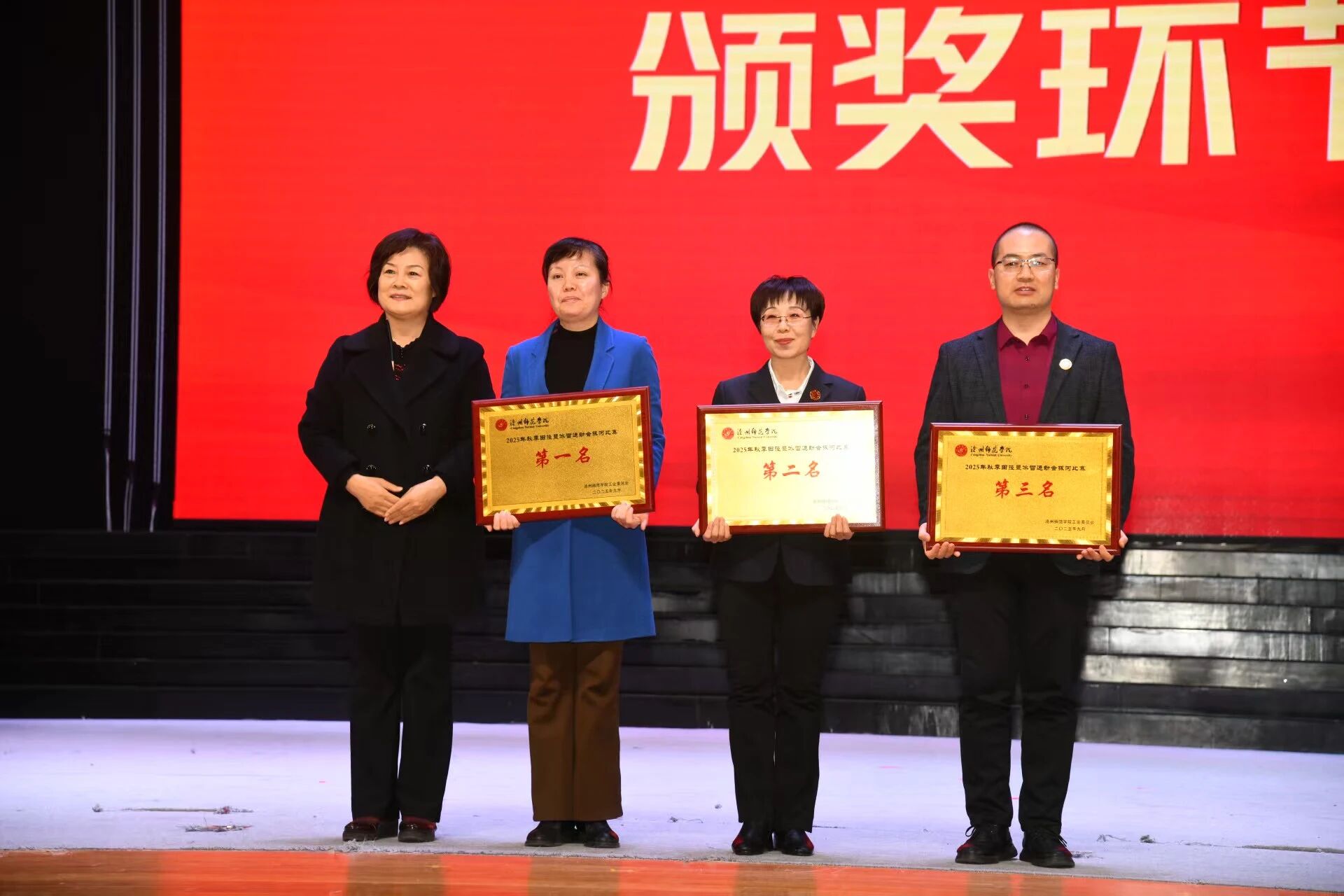 活动现场,校领导分别为2025年沧州师范学院“巾帼先锋号”和“巾帼模范”、文体类优秀教职工、“爱沧州·健步走运河”教职工健步走“优秀组织奖”、秋季田径暨冰雪运动会拔河奖项、金秋健身·数字赋能—2025年教职工秀体能减体重系列活动优秀组织奖、文体活动贡献奖的获奖团体或个人颁奖。灯光下的荣耀时刻与掌声中的真挚敬意相映成趣。从热血沸腾的奋勇争先到无私奉献的潜心育人,从专项工作的深耕细作到实践成果的精彩呈现,师院人的榜样故事凝聚着坚守初心、勇毅前行的精神内核,也鼓舞广大师生以更加饱满的热情、积极的态度,书写沧州师院发展的崭新篇章。