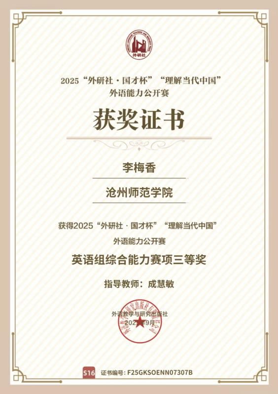 为贯彻落实“以赛促学”的教育理念,提高学生的外语综合应用能力,激发学生学习外语的积极性与主动性,教育学院鼓励学生积极参加各项英语比赛。近日,2025年“外研社·国才杯”“理解当代中国”大学生外语能力大赛国赛落下帷幕,教育学院学生在该项比赛中取得了优异成绩。