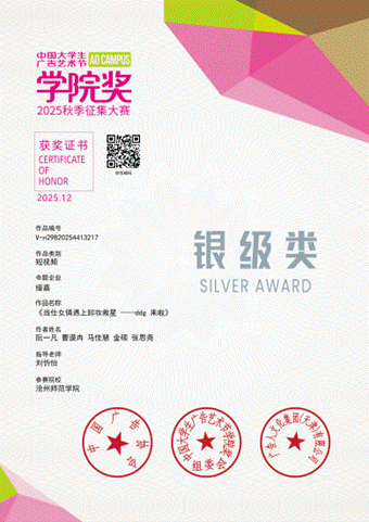 两部作品均以AIGC技术为核心创作手法,其中《逛画寻美,只为这盒珍珠膏》创新打造“AIGC复活古画+唐宫仕女直播”模式,将东方美学与现代直播带货融合,凸显品牌文化底蕴;《当仕女俑遇上卸妆救星—ddg来啦》借助AIGC实现“文物拟人化”,让唐仕女俑化身护肤“同路人”,以“西域好物援救”的创意传递产品卖点。作品凭借科技感与文化感兼具的创意,精准契合年轻化传播需求,彰显了我校学子在AIGC应用与广告创意领域的扎实实力。