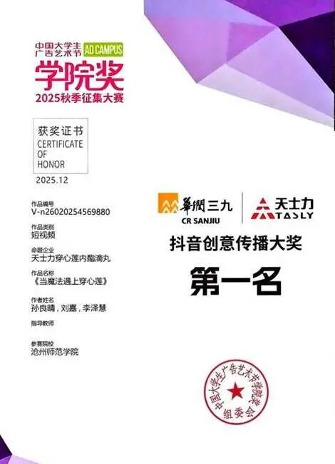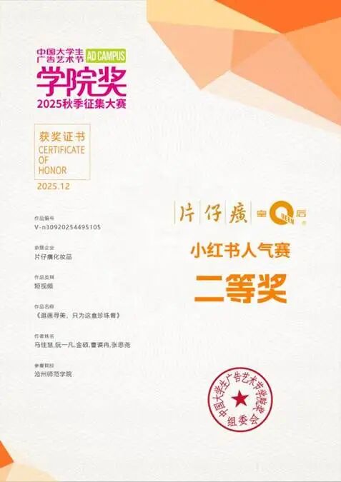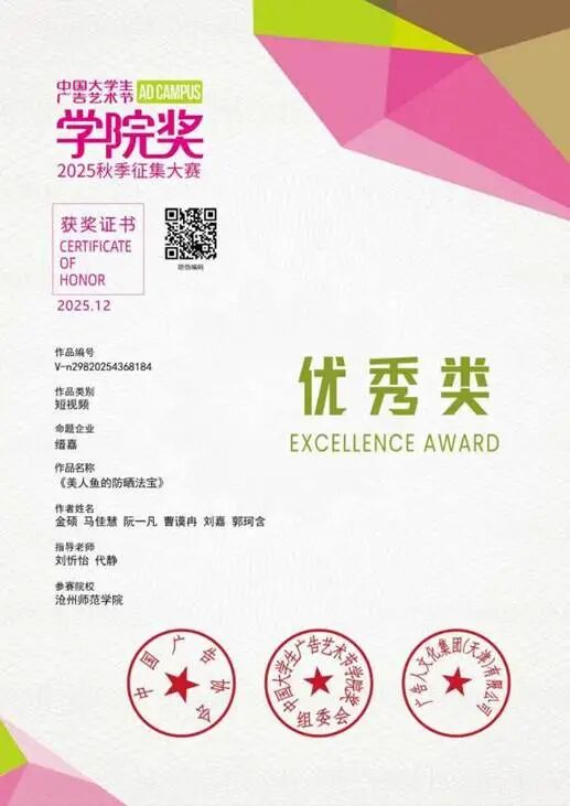 除此之外,齐越传媒学院学子在传播赛道也斩获多项成果。其中,由赵松琳老师指导,李泽慧、马佳慧、张思尧同学创作的《关爱倍加》在毓美丽命题广告文案类评选中荣获传播赛一等奖;由代静老师指导,曹谟冉、李宇珩、刘宇青、于佳美同学创作的《你是不是也有咬手指的时候》在香之派命题影视广告类评选中荣获传播赛二等奖。