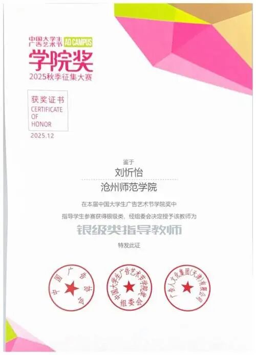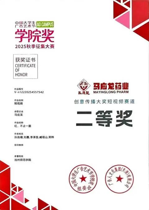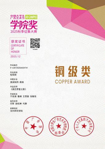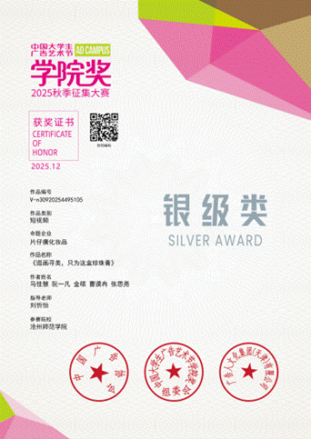 本次学院奖秋季赛启动后,齐越传媒学院教师刘忻怡依托广播电视编导专业策划方向课程《影视广告创作》,组织学生创建团队积极参赛。其中,马佳慧、阮一凡、金硕、曹谟冉、张思尧同学共同创作的影视广告作品《逛画寻美,只为这盒珍珠膏》与《当仕女俑遇上卸妆救星—ddg来啦》双双斩获全国银奖。与此同时,两部作品在传播赛道再创佳绩,分别荣获短视频类二等奖、三等奖。教师刘忻怡被授予“银奖类指导教师”荣誉称号。