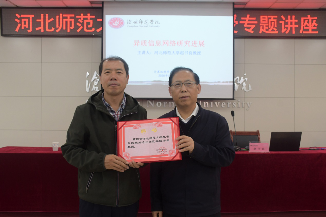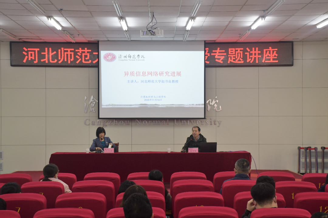 为贯彻落实“严细深实快”作风教育,增强教师科研能力,提升学科建设水平,11月16日下午,全国高等学校计算机教育研究会师范教育分会副理事长、河北省计算机学会常务理事、河北师范大学博士生导师赵书良教授应我校计算机科学与工程学院之邀,在学术报告厅举办了题为《异质信息网络研究进展》的学术讲座。讲座前,校长张占平为赵书良教授颁发了客座教授聘书,党委常委、副校长范小振出席活动。会后,党委常委、副校长彭学君与赵书良教授以及学院教师代表在会议室展开了一流本科专业建设的研讨。