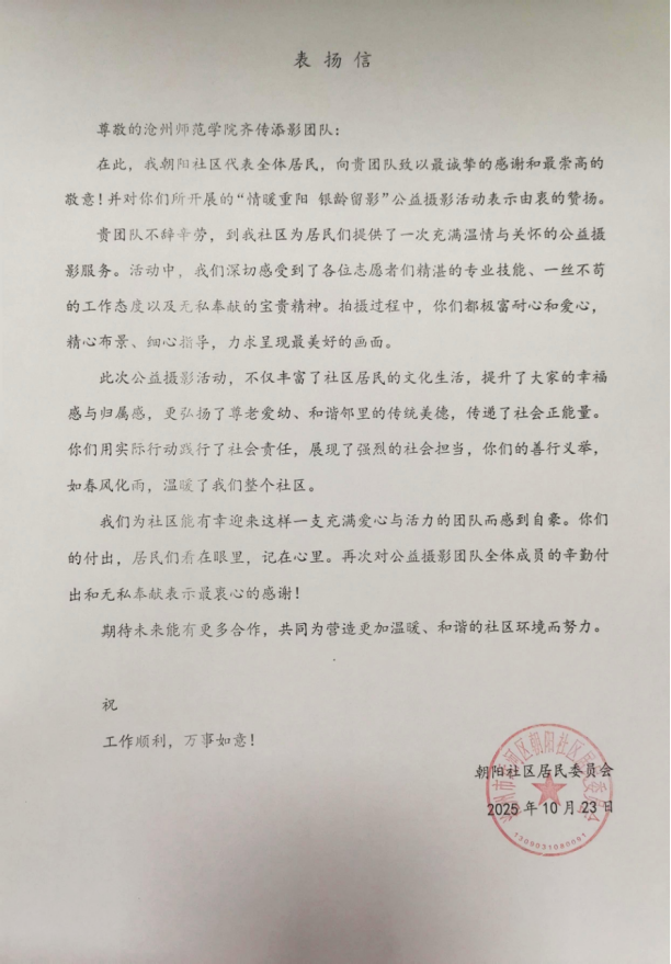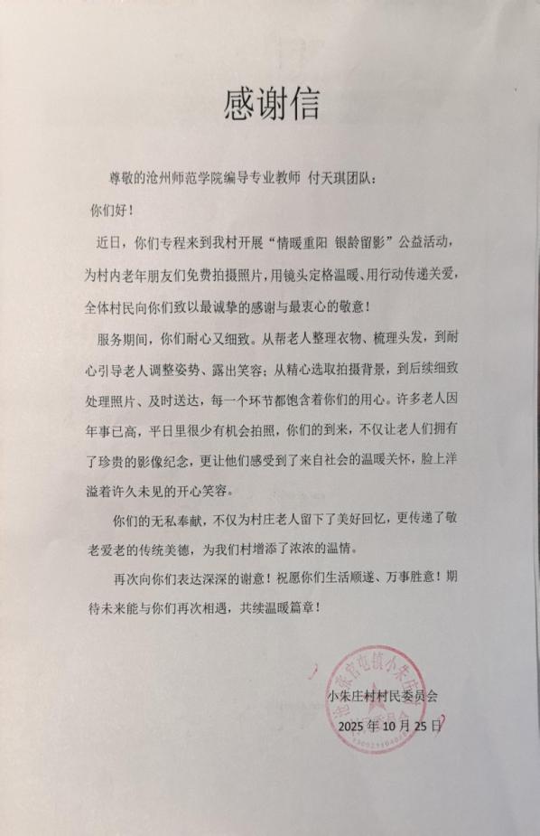 岁岁重阳,今又重阳。在重阳节过后,一场主题为“情暖重阳·银龄留影”的免费公益摄影活动,在沧州市10个社区与乡村温情落幕。活动由沧州师范学院齐越传媒学院教师、九三学社社员付天琪发起统筹,为破解老年群体证件照拍摄难题,传承尊老敬老的中华传统美德,“齐传添影”师生团队携手多方力量,以专业服务为200余位老年人及社区工作人员送去贴心关怀,用镜头定格银龄岁月里的温暖与荣光。