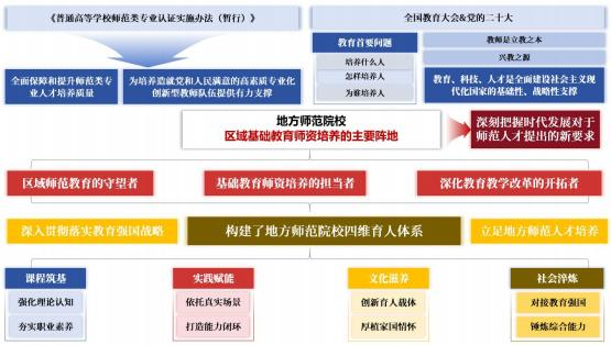 2017年,教育部印发《普通高等学校师范类专业认证实施办法(暂行)》,提出“全面保障和提升师范类专业人才培养质量,为培养造就党和人民满意的高素质专业化创新型教师队伍提供有力支撑”。2018年全国教育大会明确提出“培养什么人、怎样培养人、为谁培养人”是教育的首要问题。同时提出“教师是立教之本、兴教之源 ”。党的二十大提出“教育、科技、人才是全面建设社会主义现代化国家的基础性、战略性支撑”。地方师范院校作为区域基础教育师资培养的主要阵地,应深刻把握时代发展对于师范人才提出的新要求,努力成为区域师范教育的守望者、基础教育师资培养的担当者、深化教育教学改革的开拓者。在此背景下,我校深入贯彻落实教育强国战略,立足地方师范人才培养,以课程为根基,强化理论认知,夯实职业素养;以实践为路径,依托真实场景,打造能力闭环;以文化为灵魂,创新育人载体,厚植家国情怀;以社会为平台,对接教育强国战略,锤炼综合能力。基于此,学校构建了“课程筑基-实践赋能-文化滋养-社会淬炼 ”的地方师范院校四维育人体系,大力践行教育家精神,课程建设、教师发展、学生培养、社会服务等方面成效显著,为地方高校落实立德树人根本任务提供可复制范例。