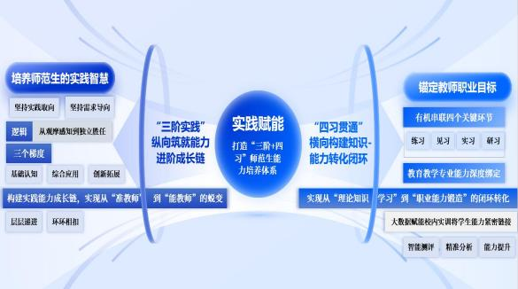 2.“ 四习贯通”横向构建知识-能力转化闭环。锚定教师职业目标,将“练习、见习、实习、研习”四个关键环节有机串联,并与教育教学专业能力深度绑定,通过大数据赋能校内实训,将学生能力的智能测评、精准分析和能力提升紧密连接,实现从“理论知识学习”到“职业能力锻造”的闭环转化。