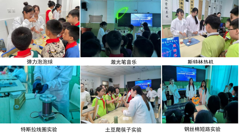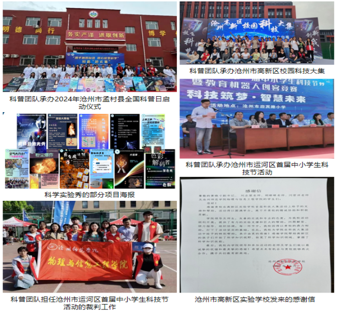 团队年均开展科普志愿服务超200课时,承办沧州市高校区、孟村县等多所小学全国科普日启动仪式、协办运河区第一届中小学生科技节等活动30余次。在活动中,师范生全程参与策划、实验演示与现场组织,临场应变与组织协调能力得到极大锻炼。通过长期的科学教育合作共建,我院先后协助沧州市重庆路小学、孟村县代林小学和沧州市实验小学成功申报为全国科学教育实验校,协助沧州市高新区实验学校和沧州市上海路小学申报为河北省科学教育实验校。