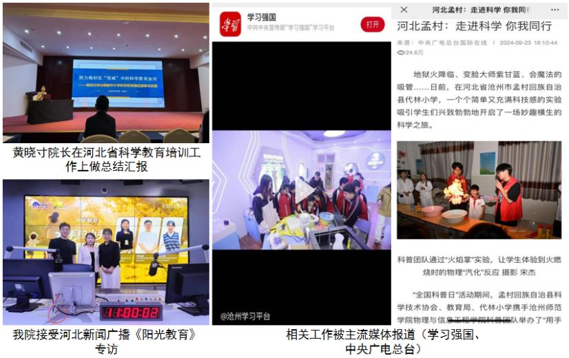 在教育厅组织的全省国家级科学教育实验校校长、省级科学教育实验校校长培训活动中,我校作为高校唯一代表,专题汇报《努力做好在“双减”中的科学教育加法——高校立体化赋能中小学科学教育模式探索与实践》。同时,系列活动引起社会强烈反响,学院曾接受河北新闻广播《阳光教育》专访,系统介绍高校赋能中小学科学教育的模式与经验;开展的多场科普活动被学习强国、人民网等主流媒体报道。