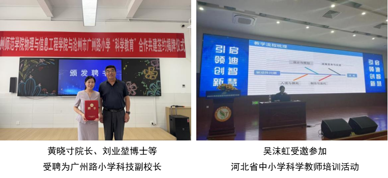 一方面,与沧州市7所中小学建立长期合作关系,黄晓寸教授、刘业堃博士等受聘为广州路小学、运河区实验小学、解放路小学、孟村代林小学的科技副校长,多名教师被中小学聘为科技辅导员或科学顾问;同时,师范生以“实习教师+科普专员”身份驻校,参与集体备课、课例研讨与日常教学。在高校教师与中小学名师的“双导师”指导下,师范生将课堂理论转化为教学实践,例如在重庆路小学,师范生协助开发“生活中的科学”校本课程,逐步掌握教学设计与课堂管理技巧。