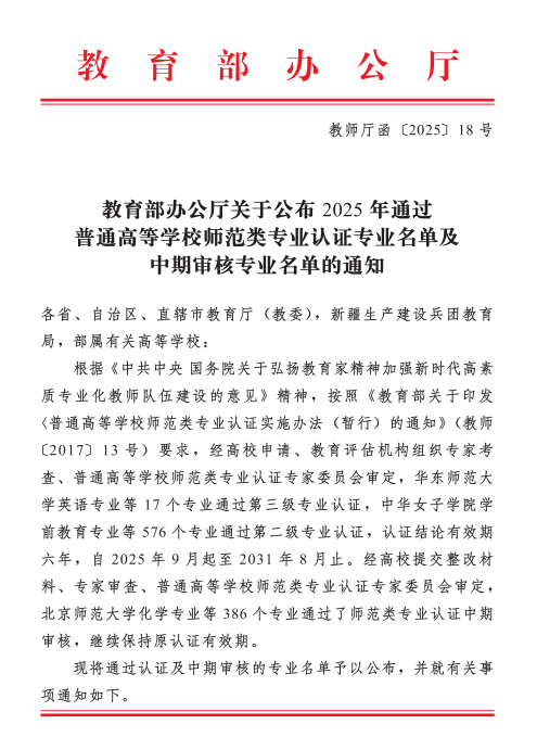 近日,教育部办公厅印发《关于公布2025年通过普通高等学校师范类专业认证专业名单及中期审核专业名单的通知》,公布了2025年通过师范类专业认证的专业名单。我校历史学、音乐学、体育教育、生物科学、小学教育5个专业顺利通过师范类专业第二级认证,认证结论有效期为6年。